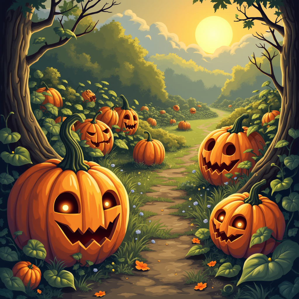 - Pumpkin Patch Fantasy: Design a whimsical pumpkin patch scene. Maybe the pumpkins have faces, or there’s a mythical creature hidden among the vines.