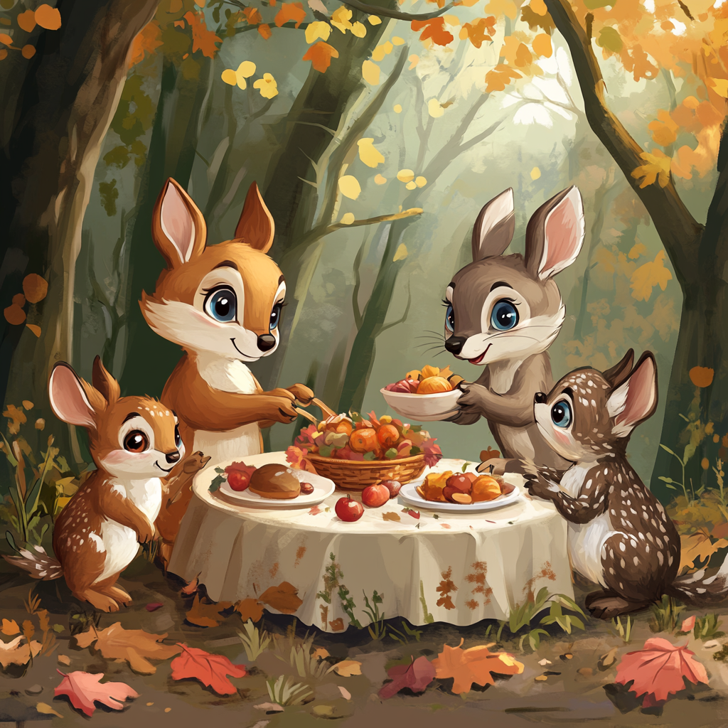 - Animal Friends Giving Thanks: Create a scene of forest animals sharing a meal together. You could go for a cartoon style or a more realistic approach.